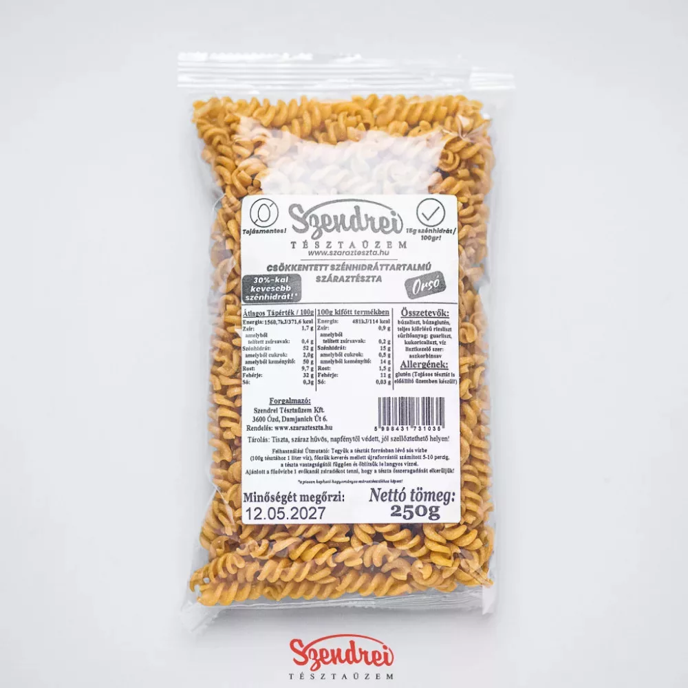 A Szendrei csökkentett szénhidráttartalmú orsó jó választás, ha olyan száraztésztát keres, amely a mindennapi főzésbe is könnyen beilleszthető, mégis tudatosabb alternatívát kínál a megszokott tésztákhoz képest. Az orsó alakú tészta jól felveszi a mártásokat, ezért különösen hasznos alapanyag, ha tartalmas, mégis tudatosabb tésztaételt készítene.