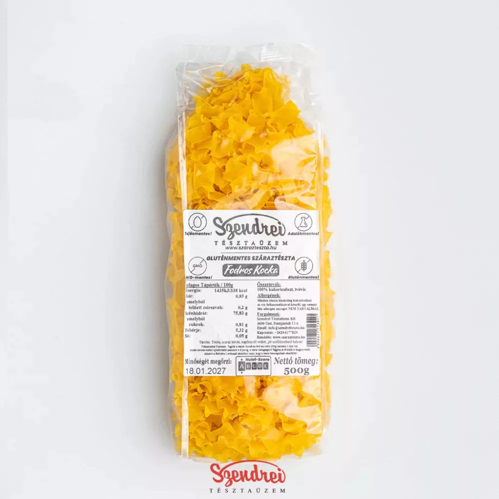 A Szendrei gluténmentes fodros kocka azoknak készült, akik gluténmentes étrend mellett is szeretnének jól használható, házias jellegű száraztésztát tartani otthon. A gluténmentes fodros kocka házias, jól variálható tésztaforma, amely pörköltek mellé, rakott tésztákhoz és zöldséges ételekhez is illik. A kukoricalisztből készült tészta természetes, kellemes ízvilágú alapanyag, amely egyszerű hétköznapi ételekhez és gondosabban összeállított fogásokhoz is bevethető.