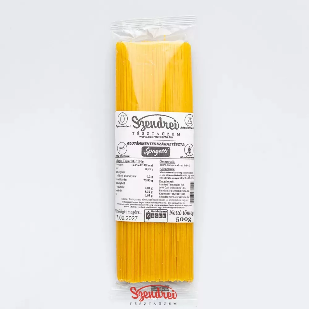 A Szendrei gluténmentes spagetti azoknak készült, akik gluténmentes étrend mellett is szeretnének jól használható, házias jellegű száraztésztát tartani otthon. A gluténmentes spagetti klasszikus alapanyag, ha gyors, egyszerű, mégis teljes értékű tésztaételt szeretne készíteni. A kukoricalisztből készült tészta természetes, kellemes ízvilágú alapanyag, amely egyszerű hétköznapi ételekhez és gondosabban összeállított fogásokhoz is bevethető.
